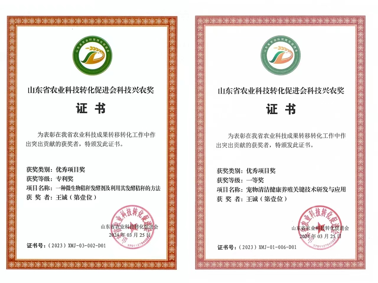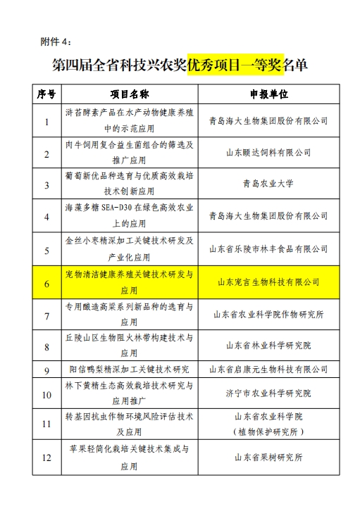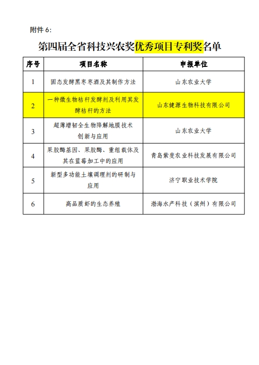 山東健源生物科技有限公司申報(bào)的《一種微生物秸稈發(fā)酵劑及其發(fā)酵秸稈的方法》項(xiàng)目獲得山東省農(nóng)業(yè)科技轉(zhuǎn)化促進(jìn)會(huì)科技興農(nóng)獎(jiǎng)優(yōu)秀項(xiàng)目獎(jiǎng)專利獎(jiǎng)。健源生物旗下子公司山東寵言生物科技有限公司申報(bào)的《寵物清潔健康養(yǎng)殖關(guān)鍵技術(shù)研發(fā)與應(yīng)用》項(xiàng)目獲得山東省農(nóng)業(yè)科技促進(jìn)會(huì)科技興農(nóng)獎(jiǎng)優(yōu)秀項(xiàng)目獎(jiǎng)一等獎(jiǎng),董事長(zhǎng)王誠為兩個(gè)項(xiàng)目的第一完成人。