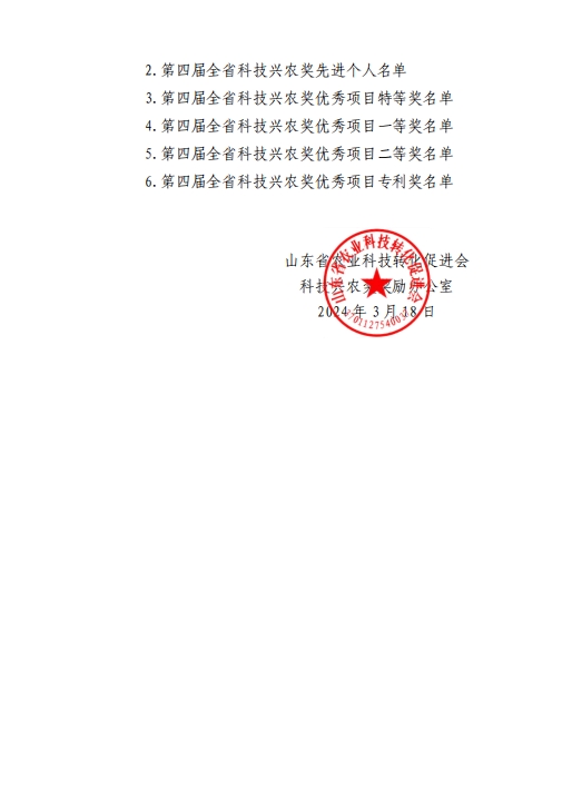 根據(jù)《山東省農(nóng)業(yè)科技轉(zhuǎn)化促進(jìn)會(huì)科技興農(nóng)獎(jiǎng)獎(jiǎng)勵(lì)章程》的有關(guān)規(guī)定,經(jīng)過評(píng)審委員會(huì)評(píng)審、獎(jiǎng)勵(lì)委員會(huì)審定,評(píng)審出了第四屆全省科技興農(nóng)獎(jiǎng)先進(jìn)集體10個(gè)、先進(jìn)個(gè)人20人、優(yōu)秀項(xiàng)目特等獎(jiǎng)2項(xiàng)、優(yōu)秀項(xiàng)目一等獎(jiǎng)36項(xiàng),優(yōu)秀項(xiàng)目二等獎(jiǎng)56項(xiàng)、優(yōu)秀項(xiàng)目專利獎(jiǎng)6項(xiàng)。