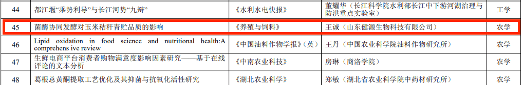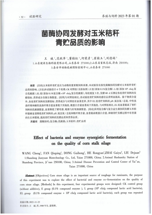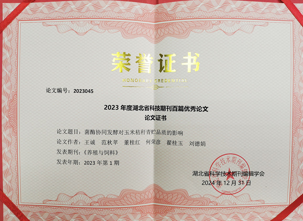 發(fā)布時(shí)間:[2025-1-15 17:6:25] 瀏覽量:2820次2024年12月31日,由湖北省科學(xué)技術(shù)協(xié)會(huì)指導(dǎo),湖北省科學(xué)技術(shù)期刊編輯學(xué)會(huì)組織實(shí)施的2023年度湖北省科技期刊百篇優(yōu)秀論文遴選結(jié)果公布,經(jīng)過(guò)評(píng)選,山東健源生物科技有限公司董事長(zhǎng)王誠(chéng)帶領(lǐng)研發(fā)團(tuán)隊(duì)撰寫的《菌酶協(xié)同發(fā)酵對(duì)玉米秸稈青貯品質(zhì)的影響》論文入選2023年度湖北省科技期刊百篇優(yōu)秀論文。